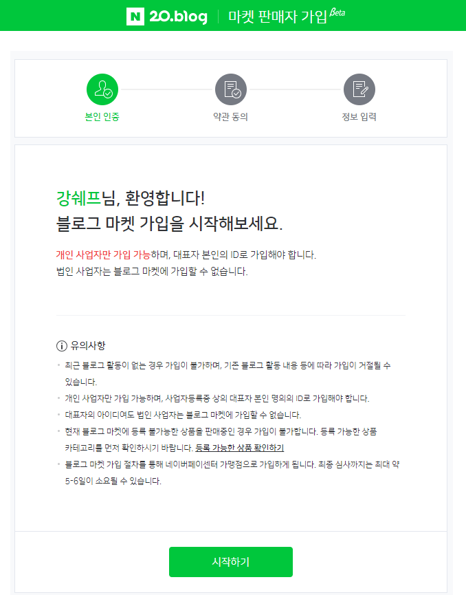 네이버 블로그 마켓은 개인사업자만 가입가능합니다. 법인사업체는 가입할 수 없습니다.